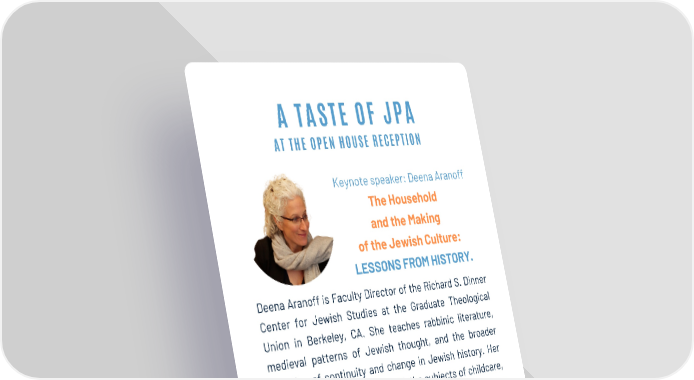 Deena Aranoff is Faculty Director of the Richard S. Dinner Center for Jewish Studies at the Graduate Theological Union in Berkeley, CA. She teaches rabbinic literature, medieval patterns of Jewish thought, and the broader question of continuity and change in Jewish history. Her recent publications engage with the subjects of childcare, household life, and the making of Jewish culture. Her book, Mother's Milk: Essays on Child-rearing, the Household and the Making of Jewish Culture is due out in September, with Indiana University Press. A TASTE OF JPA AT THE OPEN HOUSE RECEPTION The Household and the Making of the Jewish Culture: LESSONS FROM HISTORY. Keynote speaker: Deena Aranoff Wednesday, May 28th at 6:30pm Oshman Family JCC, Palo Alto CLICK HERE TO RSVP