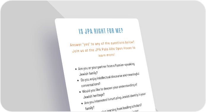 IS JPA RIGHT FOR ME? Are you or your partner from a Russian-speaking Jewish family? Do you enjoy intellectual discourse and meaningful conversations? Would you like to deepen your understanding of Jewish heritage? Are you interested in nurturing Jewish identity in your family? Would you value learning from leading scholars? Are you looking to connect with like-minded community members? Do you want to help shape your family's Jewish community? Answer "yes" to any of the questions below? Join us at the JPA Palo Alto Open House to learn more! Wednesday, May 28th at 6:30pm Oshman Family JCC, Palo Alto CLICK HERE TO RSVP