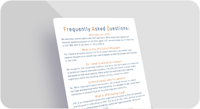 Frequently Asked Questions: Who can join JPA? We welcome Jewish adults and their partners. While many participants are Russian-speaking parents of children aged 0-23, we encourage you to reach out at 347-885-5571 if you don’t fit this criteria. What is the JPA Cohort Program? Our flagship program consists of 10-12 classes held every two weeks. Each session focuses on a Jewish topic and is taught by leading scholars and thinkers in the field. Do I need to attend all classes? We recognize that occasional conflicts may arise, but participants are expected to attend all classes whenever possible. The JPA curriculum is intentionally designed so that each session offers a distinct and meaningful learning experience while also building toward a strong, connected cohort. Is this program only for parents? No. While many participants are parents, the program focuses on Jewish heritage and learning rather than parenting. It's valuable for any Jewish adult interested in connecting with their heritage and community. What is JPA's background? JPA is an independent grassroots organization founded by Russian-speaking Jewish parents in Brooklyn in 2015. Run by an all-RSJ team, we have no political or religious agenda beyond making Jewish heritage accessible. While non- partisan, we are proudly pro-Israel. Where are JPA programs available? ·Brooklyn, NY · Manhattan, NY · Westchester, NY ·Livingston & Short hills, NJ · North Shore of Long Island, NY · Five Towns, NY ·Palo Alto, CA CLICK HERE TO APPLY